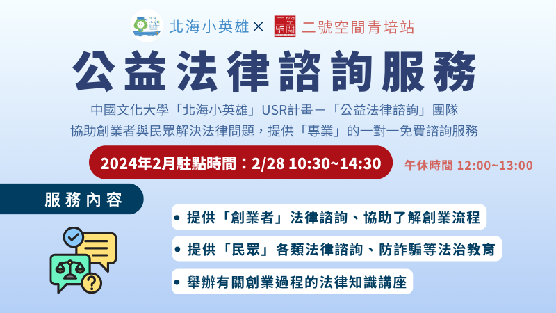 文化大學「北海小英雄」USR計畫-「公益法律諮詢」團隊與二號空間合作