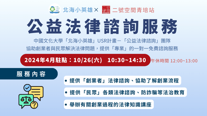 【2024 公益法律諮詢服務-10/26 三芝駐點】【法律諮詢駐點】