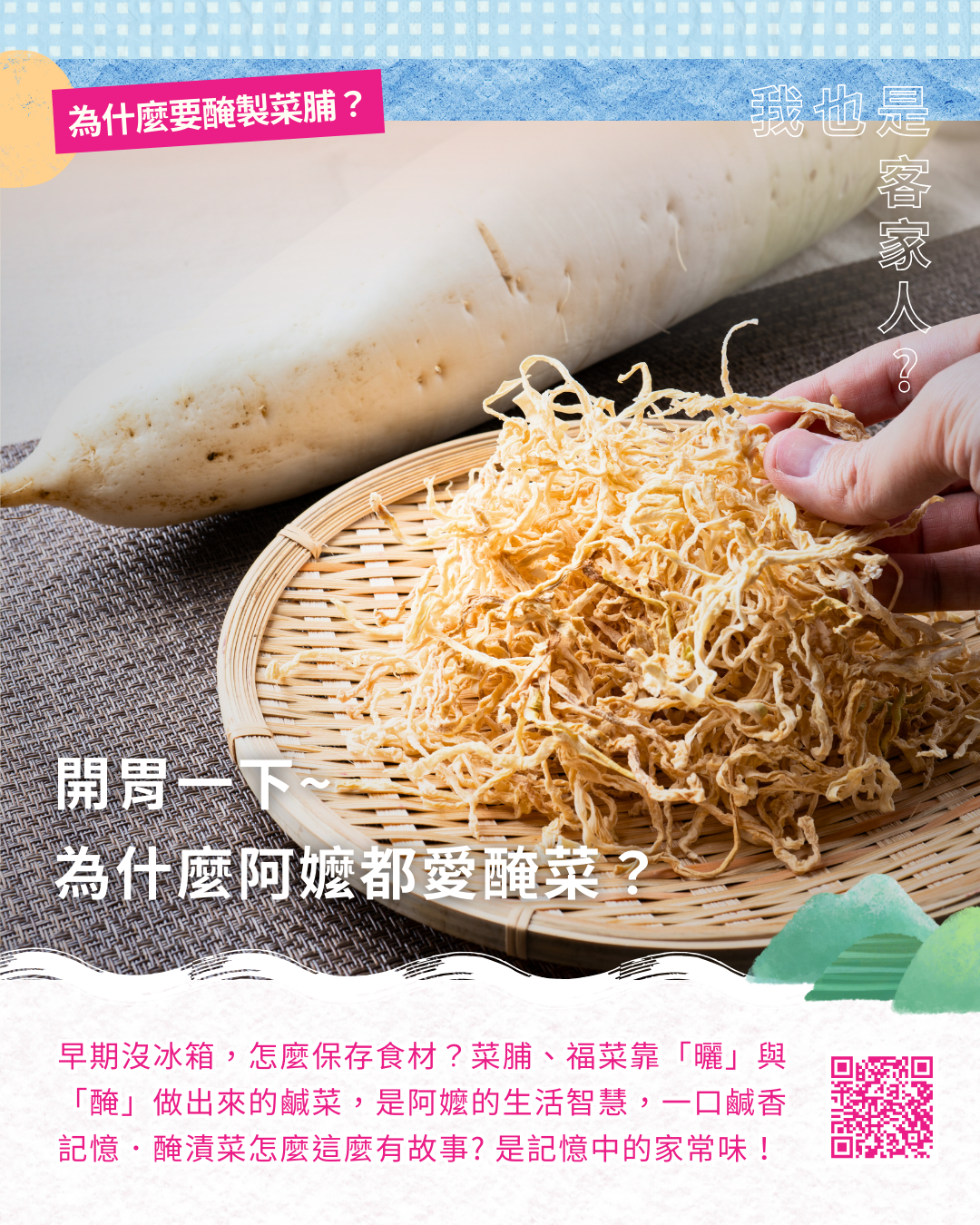 你知道嗎?早期沒有冰箱,客家人可是靠「天氣」和「時間」保存食材的高手!曬、泡、醃、藏……每一種技法,都是生活智慧的結晶:蘿蔔變菜脯、芥菜變福菜,這些看似家常的鹹菜,不只加在煎蛋或米粄裡超對味,更是很多人記憶中熟悉又溫暖的「家鄉味」。