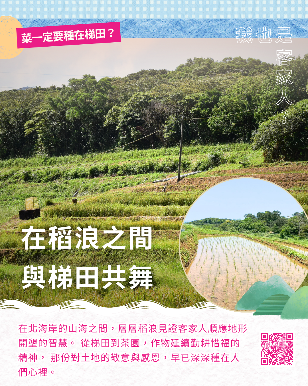 早期客家人為解決耕地不足,順應山勢開墾梯田。在層層稻浪之間是與土地共生的智慧。如今,從水稻、茶園到地瓜、茭白筍、蘿蔔、南瓜,每一株作物都延續著勤耕惜福的精神。在這片山海之間,生活與信仰、收穫與感恩,一樣深深紮根。
