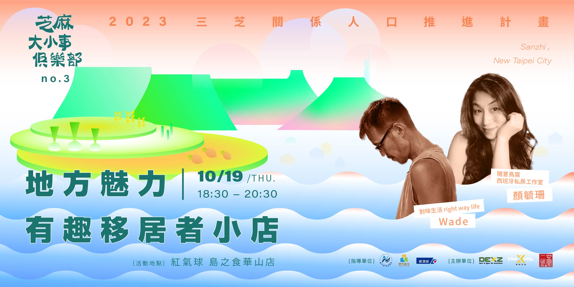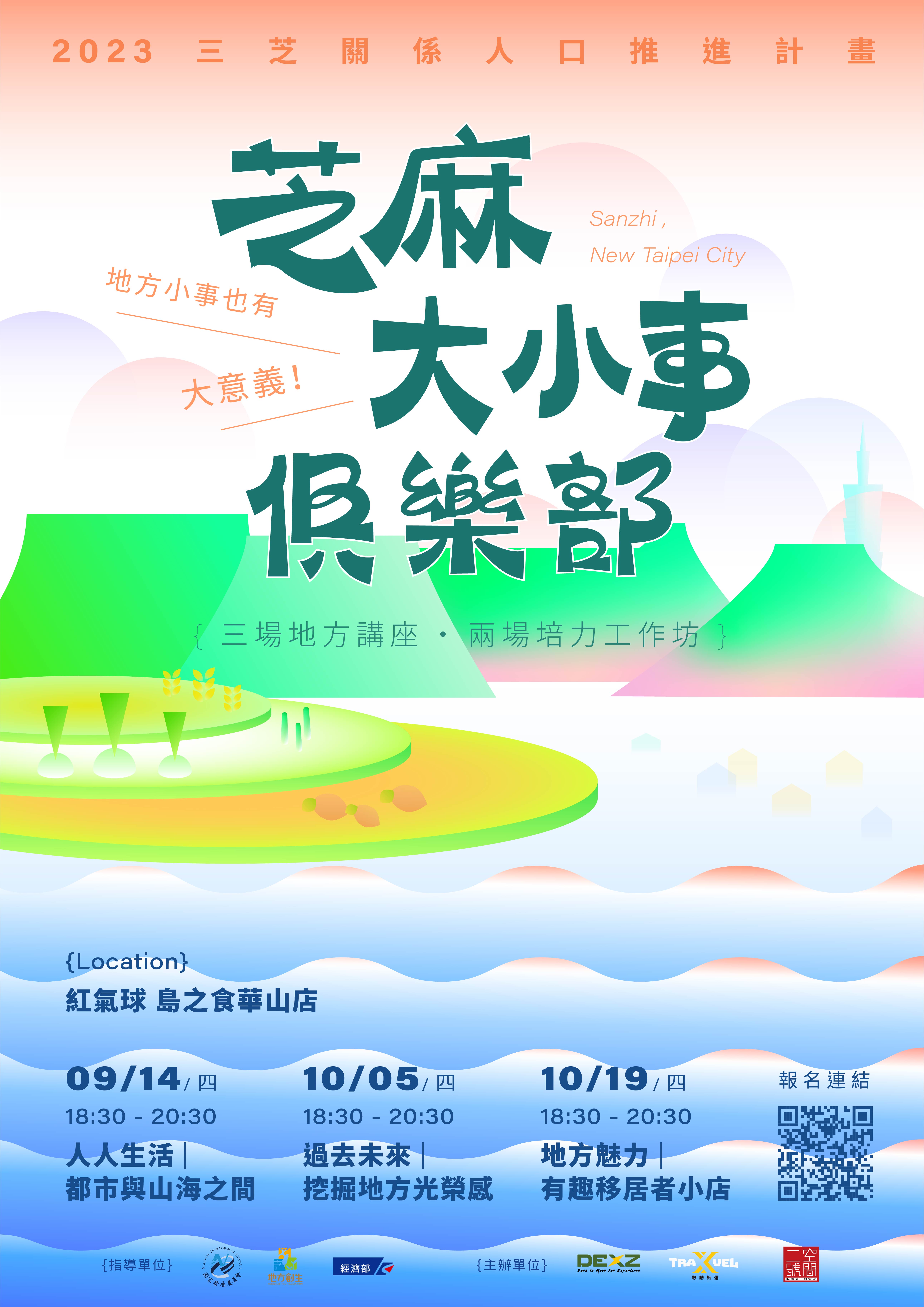 歡迎來到《芝麻大小事俱樂部》2023 三芝關係人口推進計畫! 一起走進北海岸第一區三芝,讓大屯火山群當靠山,在淺水灣漫遊 ༄༄ #地方講座 #培力工作坊 #地方小事也有大意義 3場精彩的地方講座,從不同地方小事認識靠山臨海的三芝 2場系列培力工作坊,從(入門)到(進階)培力在地導覽技能! ﹋﹋﹋﹋﹋﹋﹋﹋﹋﹋﹋﹋﹋﹋﹋﹋﹋﹋﹋﹋﹋﹋ 從淡水車程不用 30 分鐘,即可抵達三芝的淺水灣與秘境海灘,來看人們是如何在都市與三芝兩地穿梭,享受自由 切換城市與山海的生活。 三芝人文薈萃,充滿藝術氣息,過去許多偉人都生於此地,讓我們一起挖掘三芝的過去,探討現代地方普遍面臨的城鄉教育差距,一起探索,翻轉困境! 認識隱藏在三芝的有趣移居者小店,從令人感受到初心手做甜點,到充滿異國風情的西班牙料理餐,讓我們一起開箱這些魅力小店,如何在生存與生活之間尋找平衡,有出自己的理想生活! ✦名額有限,立即報名:http://pse.is/58xtdc . . . ✦ 三芝體驗遊程創新設計工作坊(工作坊內容逐步解鎖中,敬請期待!) ▋《芝麻大小事俱樂部》 ▍ 日期:09月14日(四)、10月05日(四)、10月19日(四) ▍ 活動時間:18:30-20:30 ▍ 課程地點:紅氣球 島之食華山店(台北市華山1914園區1C館2樓) ▍ 活動票價:【早鳥三場套票 $333 熱賣中!優惠售票至09/14 18:30止】 指導單位:國家發展委員會、經濟部中小企業處 主辦單位:岱科斯顧問有限公司、敢動旅運X Travel、二號空間青年培力工作站 執行單位:林 事務所 協力單位:新北市三芝區農會、新北市三芝區公所✦ 地方講座 ✦